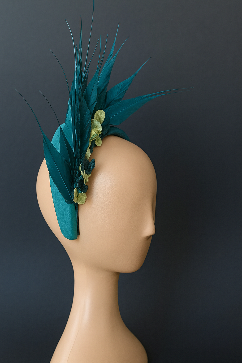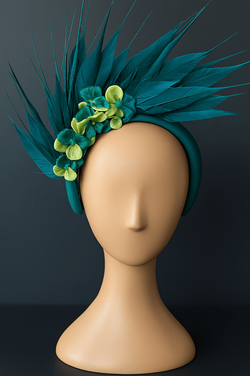 The Emerald Crown is a bold, nature-inspired statement piece featuring sweeping teal feathers paired with vibrant green floral accents. Its dramatic height and lush texture create a striking silhouette that instantly commands attention. Perfect for race days, gala events, and elegant outdoor celebrations, it brings a sense of luxury and unforgettable flair to any ensemble.