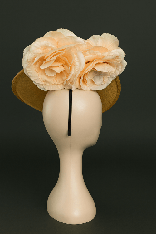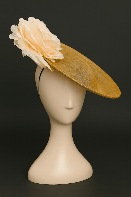 The Golden Rose is a beautifully sculpted wide-brim hat featuring a soft, oversized blossom that adds romantic elegance to its warm, sunlit hue. Its gentle curve frames the face effortlessly, creating a timeless silhouette perfect for weddings, garden parties, and formal daytime events. Graceful, feminine, and refined, this piece brings natural sophistication to any ensemble.